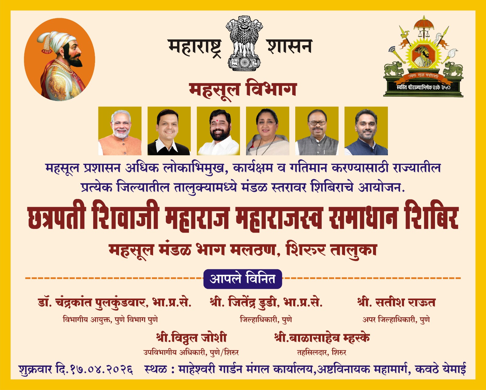 शिरूर, ता. १४ (अरूणकुमार मोटे) : महसूल प्रशासन अधिक लोकाभिमुख, कार्यक्षम आणि गतिमान करण्याच्या उद्देशाने राज्यभर राबविण्यात येणाऱ्या ‘छत्रपती शिवाजी महाराज महाराजस्व समाधान शिबिरा’च्या धर्तीवर मलठण (ता. शिरूर) महसूल मंडळांतर्गत कवठे येमाई येथे शुक्रवारी (दि. १७) भव्य शिबिराचे आयोजन करण्यात आले आहे. अष्टविनायक महामार्गावरील माहेश्वरी गार्डन मंगल कार्यालय येथे होणाऱ्या या शिबिरामुळे ग्रामस्थांना विविध शासकीय सेवांचा लाभ एकाच ठिकाणी मिळणार आहे.
